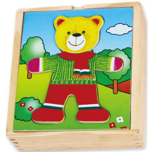 This Dress Up Bear set contains a variety of brightly coloured wooden pieces, including 6 two-piece outfits and 6 bear faces with different expressions. Build the bear and its outfits on the lid which has cut out slots to easily fit the different shaped pieces. When the play session is over, the wooden pieces can be stored safely in the box with a slide-in lid. Great for developing coordination, dexterity and of course imagination. Age 3+. In the box - • 6 Bear faces, • 6 Two-piece outfits, Box Size: 130 x 140 x 140mm