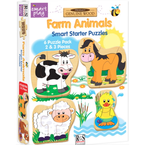 Smart Starters wooden puzzles are the perfect introduction for toddlers, from 2 years to jigsaw puzzles. Farm Animals offers 6 different self-correcting 2 and 3 piece wooden jigsaw puzzles focused around the curriculum friendly theme. These puzzles are perfect for use at home and pre-schools. Age 2+.
