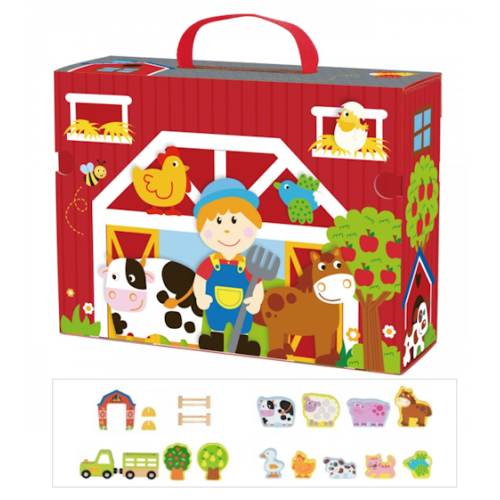 Size: 29x27x9.5cm. Age 3+. The Farm Play Box is a charming creation by Tooky Toy, perfect for on-the-go fun. This delightful set allows kids to imagine farm life with a fold-down front panel that reveals an interactive play area. It includes a wooden farmer, tractor, animals, and various accessories. Age 3+ years. Dimensions: 29 x 27 x 9.5cm